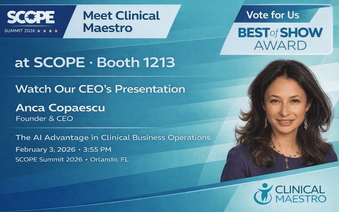 As part of the SCOPE 2026 agenda, Anca Copaescu, Founder & CEO of Clinical Maestro, will deliver a featured session focused on the strategic role of artificial intelligence in clinical business operations.